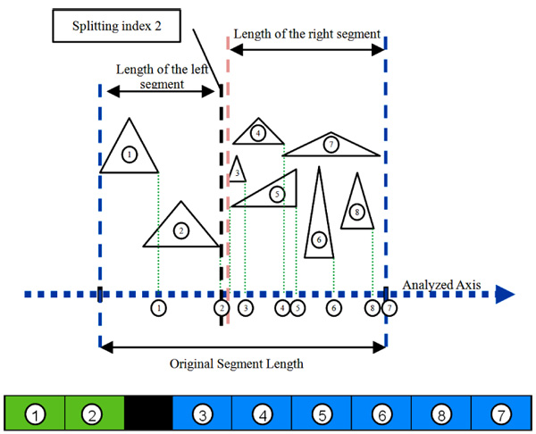 • For each triangle in the triangles vector compute the sum of the projection lengths on the axis divided by the original graph projection lengths of the two sub-graphs and split this triangle in order to get a smaller sub-graphs.