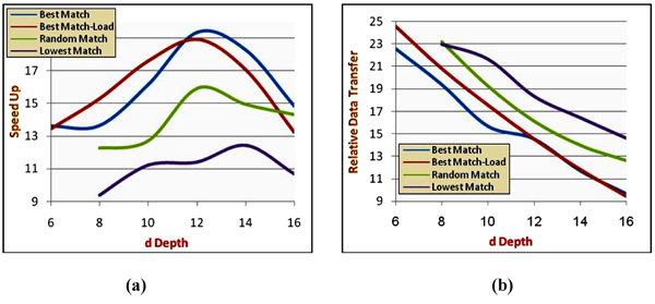 Fig. (8). Distribution depth effect in the vehicle of (Fig. 5) on (a) speedup (b) relative data transfer.