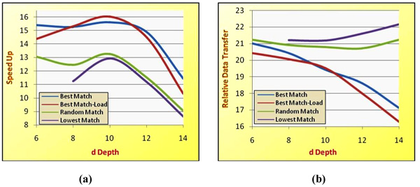 Fig. (9). Distribution depth effect in the vehicle of (Fig. 7) on (a) speedup (b) relative data transfer.