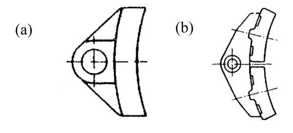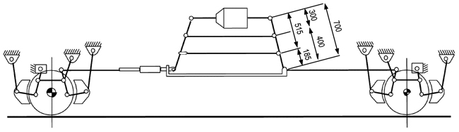 Fig. (9) shows braking scheme of a wagon equipped with an empty-load device: dimensions here reported are in millimeters and represent an example of geometry. A configuration 2xBg is displayed in this figure. Fig. (10) shows more in detail the geometry of Bg shoe (a) and Bgu shoe (b). Dimensions of friction surfaces for these two types of shoes are as follows (in millimeters): 320x80, for Bg and two surfaces of 250x80, for Bgu.