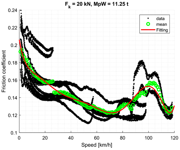 Fig. (2) shows an example of polynomial fitting by means of method 1; fitted curve is reported in solid red, whereas green circles represent average data and black asterisks raw data. Fitting refers to a mass per wheel (MpW) of 11.25 tons and a normal force (Fk) of 20 kN.
