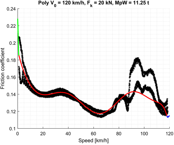 From the test results obtained for each UIC approved friction material the static friction coefficient is a function of normal force between wheel and shoe; it varies from 0.23 (low normal force) to 0.21 (high normal force). In this paper, variation of friction coefficient between these two bounds is assumed linear with normal force, varying from 12 kN up to 100 kN. Connecting polynomial at low speed is of third order and it guarantees point and slope continuity with polynomial data fitting (red curve). Such third order polynomial has a slope at zero speed given by the straight line that connects static friction coefficient to first point of polynomial data fitting. Different conditions are set for the connecting polynomial at high speed (blue line): this is still a third order polynomial with point and slope continuity with polynomial data fitting, but it has zero slope at maximum (starting) speed V0 and the value of friction coefficient at this speed is equal to the value of friction coefficient at maximum speed of polynomial data fitting.