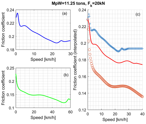 Fig. (4) shows an example that refers to a starting speed of 40 km/h, when the MpW=11.25 tons and Fk=20 kN: as it is clear, the curve that refers to the lower starting speed is linearly extrapolated and then the linear interpolation is applied. Fig. (4c) shows with solid line the interpolating polynomial that describes the instantaneous friction evolution with speed for a stop – braking from initial speed of 40 km/h.