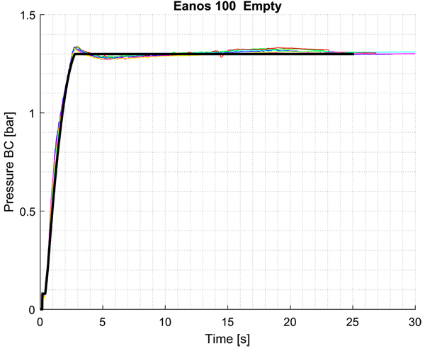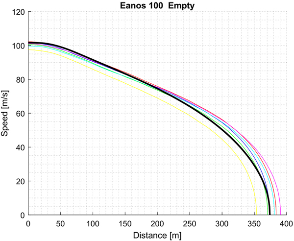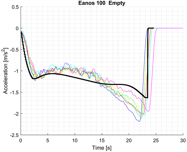 Fig. (5) shows the time evolution of air pressure in BC for Eanos wagon. Test considered is emergency braking in empty conditions from nominal speed of 100 km/h. Numerical results are displayed by black solid line, experimental results by coloured solid lines. Experimental results and numerical results are in a good agreement; anyway, experimental results show an oscillation of air pressure, which is not displayed by numerical results. The reason of such difference is that air pressure in BC is computed numerically by means of a stationary model from limiting curves and transfer function of distributor [19]. This (small) difference between numerical and experimental pressure in BC differentiates numerical and experimental results in terms of speed and acceleration. It is worth remembering, in fact, that the deceleration of the wagon is the effect, among other aspects, of the product between the normal force between shoes and wheel and the coefficient of friction. Friction coefficient depends not only on the speed of the rolling stock but also on the value of the normal force between wheel and shoe, which depends, among other aspects, on the value of the air pressure in the brake cylinder.