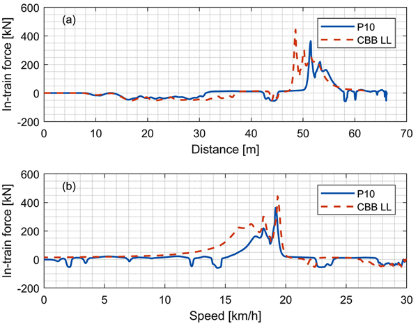 Aiming to provide a first understanding of the effect of CBB type LL on in-train forces, a series of simulations on homogeneous trains have been performed. An emergency braking on a straight plain track from 30 km/h has been simulated, considering trains whose mass is equal to the current limits allowed by UIC CODE 421 [10] for different braking regimes (P, GP). Table (7) shows simulations results in terms of stopping distance, 10 m Longitudinal Compressive Force (LCF10) and instantaneous Longitudinal Tensile Force (LTF). LCF10 is the minimum in-train compressive force acting in the 10 m before the current position. LCF10 is used to synthetically test the safety against derailment of train makeup, whereas LTF can be used to evaluate the risk of train disruption. In-train compressive forces are displayed with a negative sign. According to the simulations, CBB type LL effect in-train forces providing lower values for G and P regimes and higher values for GP and LL regimes. Best performances are for P regime where both stopping distance and in-train forces are usually reduced (in absolute value).