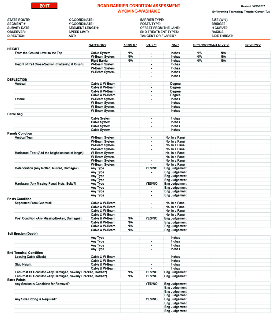 This research was the first effort regarding establishing a new rating system called Barrier Condition Index (BCI) which would be useful to unify the barrier assessment studies. The new BCI included different variables either from the viewpoint of the geometry (height, offset) or the variables related to the hardware condition (deflection damages, panel condition, posts condition, soil erosion, and the end-treatment condition). The procedure of the barrier assessment was also described by a case study conducted in Wind River Indian Reservation (WRIR), Wyoming. As a summary of the procedure, surveyors need to record all the damages and information related to the barriers condition using the proposed “Barrier Condition Assessment (BCA)” worksheet (Fig. 2). Then, the input of each category (each variable) will be rated based on the criteria presented in Table 1. Finally, as shown in Fig. (3), an average BCI will be given to each barrier system considering different coefficient for each variable (according to their impact on the condition extracted from previous studies). The developed BCI can be implemented in different states to optimize the barrier improvements based on a prioritized ranking. The benefits of using the BCI to obtain such as prioritized ranking can be more clear and significant in large-scale projects including numerous barrier segments. As a further work, the research team will use the current BCI to analyze the barrier segments statewide all around Wyoming in a new project defined by Wyoming Department of Transportation (WYDOT).