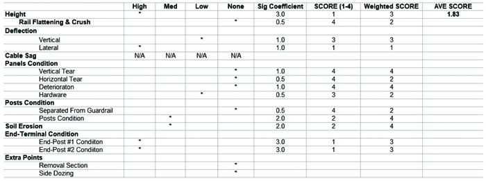 A “Barrier Condition Assessment (BCA)” worksheet was developed in this study after reviewing previous studies [3, 21, 22). Fig. (2) shows a screen of the worksheet. This worksheet covers all the damages involved with barrier assessments including geometric features (height, and offset) as well as the hardware condition (deflection damages, panel condition, posts condition, soil erosion, and the end-treatment condition). In the next step, barrier segments will be rated on a scale from 1 to 4 to investigate the sections with the most severe condition. The score 4 means an ideal condition with no error regarding design, dimensions, and the type of barrier and end-treatments used, while a 1-rated site shows a high-severity condition that the barrier is obsolete and is no longer able to provide a safe service. The rates 2, and 3 also belong to the medium, and low severity conditions, respectively. Note that the criteria used for the rating were inspired based on the tests done in NCHRP report 656 [22] and provided detail of various types of barriers in the RDG [3]. Table 1 presents the criteria considered for rating (from 1 to 4) in the study. Note that some of the variables inside the worksheet should be rated based on the engineering judgment and these variables are excluded from Table 1. In fact, the damages such as deterioration need to be graded based on observations, and there is no other way to use any measurements to estimate the level of the severity for them. The criteria for each type of damages in Table 1 is different based on their role in the severity of crashes. For example, observing any single vertical tear on the panel introduce the condition as a high-severity damage; however, a condition called as high-severity for the horizontal tears when there are at least three of them on the panel. Finally, the damages received various coefficients based on their impacts on the performance of the barrier found from the previous studies [3, 21, 22]. Fig. (3) has illustrated an example of the BCI gained after completing the data collection at one of the sites. Fig. (3) shows an average score (BCI) equal to 1.83 for this barrier segment. This means that the barrier is in the category of high-severity damages.