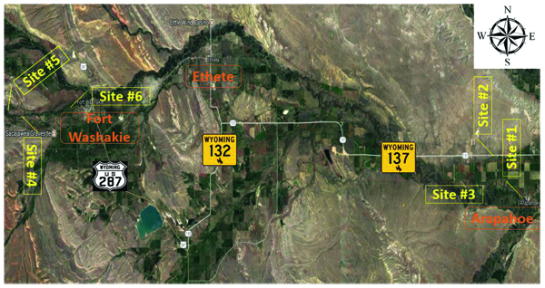 As it was mentioned earlier, six different sites were selected for this project. Fig. (4) illustrates the position of the six sites in WRIR, Wyoming, while a comprehensive information regarding the GPS (Global Positioning System) coordinates, segment length, Annual Average Daily Traffic (AADT), and the speed limit has provided by Table 2. As it is indicated in Fig. (4), the sites were located by half in the northwest of Arapahoe and the west side of Fort Washakie. US-287, WY-137, and WY-132 were also the main highways in the area. Totally, 200 m (655 ft) barrier segments were analyzed in this study as shown in Table 2.