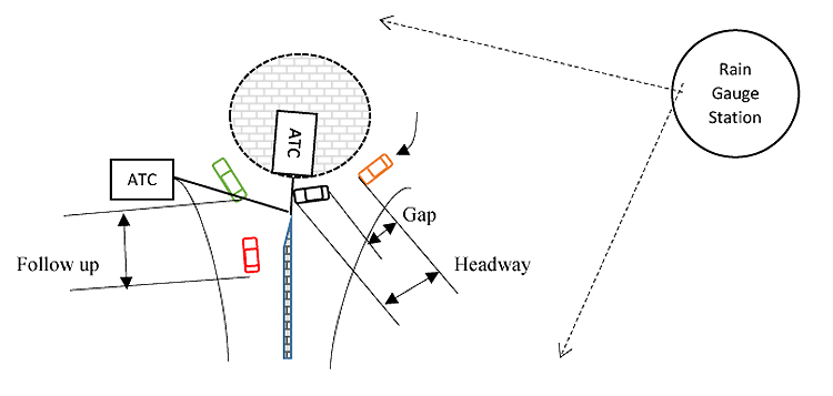 Three classes of vehicles passenger cars, light vans, and bus/coach/truck were identified and three classes of rainfall intensity recorded; light (intensity < 2.5mm/h), moderate (2.5 ≤ intensity < 10 mm/h) and heavy (10 ≤ intensity < 50 mm/h) AMS [15]. The study used automatic traffic counter (ATC) to collect entry and circulating traffic flow data continuously for six weeks at each site. Four selected sites were surveyed in Durban, South Africa. Surveyed sites have bituminous surfaces, functional and effective drainage and located at about one km from the nearest rain gauge station. Note that time headway differs from gap because it is measured from the front bumper of the front vehicle to the front bumper of the next vehicle and also that follow-up time can be measured directly from observed data. The typical setup of a survey site is shown in Fig. (2) where ATC denotes automatic traffic counter, and RGS denotes rain gauge station. Geometric parameters for surveyed roundabouts are shown below in Table 1. Note that v denotes approach half width; e is entry width; r is entry radius, D is inscribed diameter; <o is entry angle; k is correction factor; E is entering vehicles; C is circulating vehicles; PC passenger is cars; LV is light vans; HB is heavy vehicles, trucks and buses.