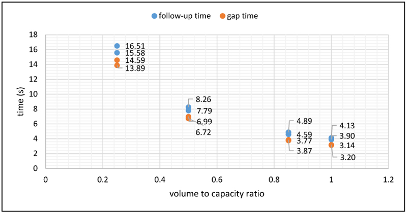 Although a slight improvement occurred when the degree of saturation is at the threshold value of 0.85, nevertheless the average follow-up time under dry weather conditions is 4.58s and 5.14s for rainfall, an increase of 12.2%. As for gap acceptance, the average time for dry weather conditions is 4.15s against 4.57s for rainfall, an increase of 10.1%. When the degree of saturation was set at 0.5, the average follow-up time under dry weather conditions is 7.78s and 8.74s for rainfall, an increase of 12.3%. As for gap acceptance time, the average for dry weather conditions was 7.36s against 8.18s for rainfall, an increase of 11.1%. In any case, the average follow-up time under dry weather conditions is 3.89s and 4.37s for rainfall, a 12.3% increase. As for gap acceptance time, the average for dry weather conditions is 3.46s against 3.79s for rainfall, an increase of 9.5%. So, it is correct to assert that irrespective of whether the drivers have priority at the roundabouts or not, they are restrained by rainfall.