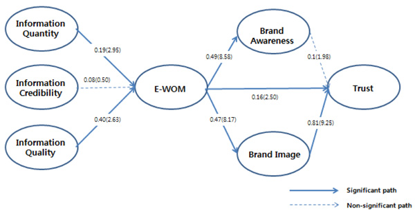 Among the information characteristics in social media, the effect of information quantity on e-WOM was β=0.19, C.R.=2.95(p<0.001), confirming that it had a statistically significant effect. This indicates that information quantity in social media is a leading variable capable of activating e-WOM. Information quality in social media had a statistically significant effect on e-WOM as β=0.40, C.R.=2.63 (p<0.001), showing that as the quality of information increased, e-WOM activity increased. The result of this study was in accordance with the previous argument [80] that the quantity of information and information quality have a significant impact on word-of-mouth activities. e-WOM had a statistically significant effect on brand awareness and brand image, which were the main factors of brand equity. The results of the analysis for the effect of e-WOM on brand awareness were β=0.49, C.R.=8.58(p<0.001), while the results for the effect of e-WOM on brand image were β=0.47, C.R.=8.17(p<0.001). The results of this study were consistent with the results through several previous studies [56, 58-60]. In other words, when e-WOM was activated, brand awareness increased. In addition, brand awareness could be improved through e-WOM activities, and when an airline was remembered or identified, this was reflected in the memories of the consumers. However, among the information characteristic variables, information credibility did not have a significant effect on e-WOM. In addition, while brand awareness did not have a significant effect on trust, brand image and e-WOM were confirmed to have a statistically significant effect on trust. The value of analysis for the effect of brand image on trust was β=0.81, C.R.=9.25(p<0.001), and for e-WOM, it was β=0.16, C.R.=2.50(p<0.001). This indicated that as the brand image improved, deeper trust formed, and the customers for which trust was established were more important from a company’s perspective because they shared the values and resources of the company and developed relationships with the company. In other words, a positive e-WOM could strengthen the brand image and establish a strong level of trust between brand and customer. Furthermore, e-WOM had a direct effect on trust formation.