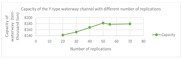 After running our traffic flow simulation model for one year, we used it to determine the capacity of a complicated port system as a whole, taking into account the Y-type waterway intersection.