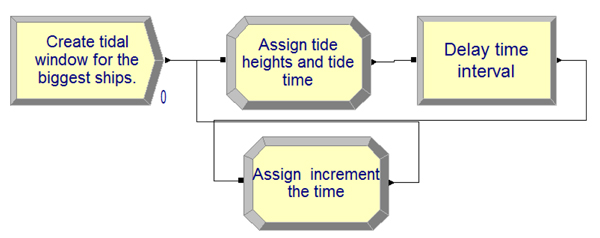 To simulate the tidal window in the Arena simulation model, we used a variable to simulate the daily tidal level per hour over 365 days of one year of Port operations. Moreover, we generated a sub model as shown in Fig. (3), using “assign modules” to define variables for the tide level and its corresponding time. Moreover, other “assignments” for calculating the tidal level and tide period were considered. If the ship needs a tidal window to sail through the channel to its allocated berth, as an inbound ship it can use this sub model to calculate the current continuous tidal duration with the high tide window. Once it has met enough tide window and traffic conditions, the ship sails through the channel to its allocated berth to begin the handling operation at berth. An outbound ship will do the same checks, the only difference being the revised direction of the movement.
