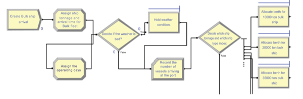 Indeed, channels should use traffic flow simulation models to estimate the capacity of port navigation [5]. Because the traffic system of the approach system is complex, most of the ports all over the world have different terminals in a harbor with various fleet types, and each fleet has different arrival times due to the stochastic operations in the port, which need to deal with different ship types, with various service levels, tidal windows and other traffic rules. In this paper, Arena simulation has been used to simulate a complex port access channel network based on the above flow chart of the logical model and the assumptions to simplify a complex port network, in order to study the navigation channel capacity under various operating conditions.