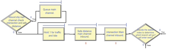 For inbound ships, after the ship seizes a berth and meets weather conditions and the tidal window for the biggest ships, safety for sailing through the channel must be checked, and one must ensure there is no outbound ship in the main channel or eastern and western branches, and ensure that the security time between it and the previous ship is 10 minutes. Then it can sail through the main channel and enter the eastern or western branch. The author states some conditions by using work in process (WIP) in the “process modules” to check the traffic rules, similar to the highways [9]. If the check intersection and safe distance conditions are not safe, the ship will wait in the Anchorage area, using “hold module” for the ship to preserve its place in the queue until channel accessibility, as shown in Fig. (5), using “Route” and “Station” modules to guide the ship to its destination station. Then “delay modules” are used to simulate handling time at the berth, as illustrated in Fig. (6). After completing the loading and unloading of the ship, an outbound ship will wait to use the channel, checking the tidal window (if it is necessary) and traffic conditions.