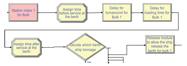 The different fleets for our case study for the eastern area of Panjin port in China, are Container, General, Bulk, Chemical, Refined oil, Ro/Ro and Crude oil fleets. Each fleet has different ship tonnage. To simulate the arrival process for each fleet type, we generated a “Create module” to define the time between two successive arrivals (the inter-arrival time between ships for the same fleet), by using negative exponential distribution. Using the discrete function to define different ship tonnage for the same fleet, as an example, we will take a bulk fleet type to illustrate how to use the discrete function. Firstly, one “create module” is used to represent the ship arrival for this fleet type. To distinguish between different ship tonnages for the same fleet, an “assign module” was used to define an attribute called ship tonnage, which is illustrated in Table 2. Inside this “assign module,” we used a discrete function which is described in the Arena by this formula: DISC (Cumulative probabilities, and values), so with using the Table 2 values we got DISC(0.13,1,0.34,2,0.61,3.5,0.97,5,0.99,7,1,10). At the same “assign module” we have defined an attribute for the ship type index, which will be used to follow the path of this fleet anywhere within the model and another attribute to record the arrival time for each ship.