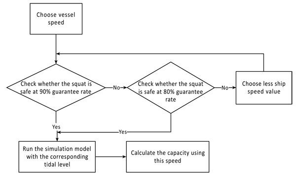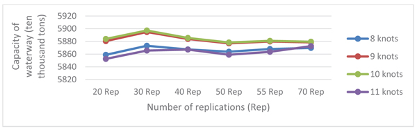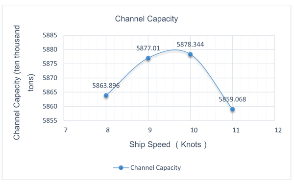 We chose the access channel for the eastern area and rebuilt the simulation model. After comparing the capacities of the waterway by using different ship speeds, we notice that when a ship sails at 10 knots, it will produce the maximum channel capacity, while sailing with 11 knots gives the lowest capacity value. This is because the larger ships will need to wait for a long time to meet the higher tide level whose cumulative frequency for channel accessibility is equal to 80%.