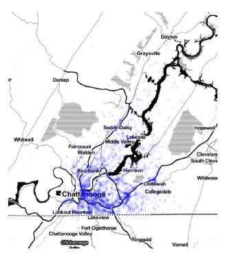 Over the collection period of two years, 55,324 total accidents were reported in Hamilton County. As seen in Fig. (2), accidents occurred in highly populated areas within the city limits of Chattanooga as well as in less populated, rural areas in the county.