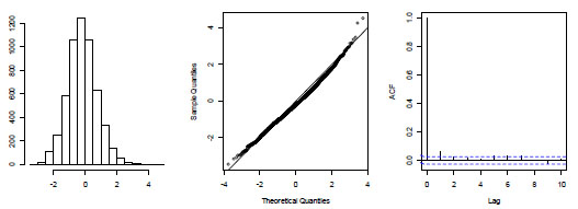 The key assumptions for NB models, and GLMs in general, are homogenous, Normal, and independent deviations centered on zero [65]. For our case, these assumptions are met and we present diagnostic plots for support (see Fig. (3)). From the histogram (left) and Normal quantile-quantile plot (center) of the model residuals, we have evidence that deviations are both Normal and centered at zero. From the autocorrelation plot of residuals, we find no evidence of dependence. Thus, our model form is valid.