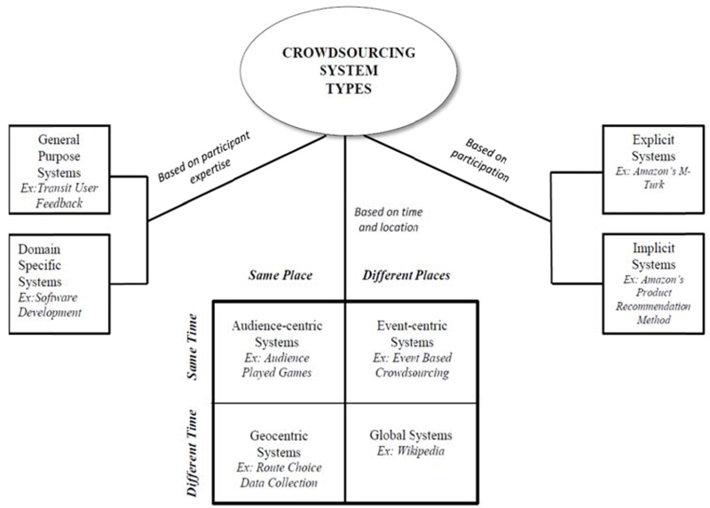 Crowdsourcing system types are divided into three types - based on participation expertise or no expertise and based on time and location (Fig. 2). Participant expertise is important as this elicits a response from actual transport mode users, while general participation is useful when expertise is not an issue; however, an informative idea is formed about the utility of a system using a general participation of non-experts. A crowdsourcing system can further be classified based on whether the information that is sought at the same place or if the participants are at different places. Audience-centric (audience played games) and geocentric systems (route choice data) are the same place sub-systems, while event-centric (event-based) and global systems (such as Wikipedia) are different places sub-systems.