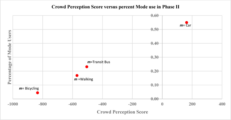The chart in Fig. 3 shows the variation of crowd-based perception score, Φm, versus percentage of users for the four modes. It is noted that as the value of Φm increases, there is also an increase in the number of users for the modes. Car has the largest value for Φm, with the highest percentage of users, while bicycling has the smallest Φm with the lowest percentage of users. Thus, this empirical analysis serves as a validation for the crowd-based perception score developed in this research. City planners and stakeholders can improve ridership and user frequencies of sustainable transportation modes (such as transit, bicycling etc.) by utilizing the crowdsourcing technique of soliciting public opinions, which are transparent and are on specific infrastructure facilities. Furthermore, using the crowd-based perception score developed in this research, the future popularity of the modes can also be assessed.
