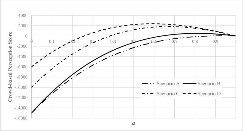 Scenarios A and B show that with a negative perception of using mode m (i.e.) being the maximum, Scenario B attains a positive perception score at α = 0.63 (with lower Xm, higher Ym) before Scenario A which attains a positive perception score at α = 0.89 (with higher Xm, lower Ym). This is due to the positive perception of using mode m (i.e. fYm,p) being higher for Scenario B as compared to that of Scenario A. This is expected since a higher positive perception of a mode will accelerate its acceptance among individuals who have an overall negative perception.