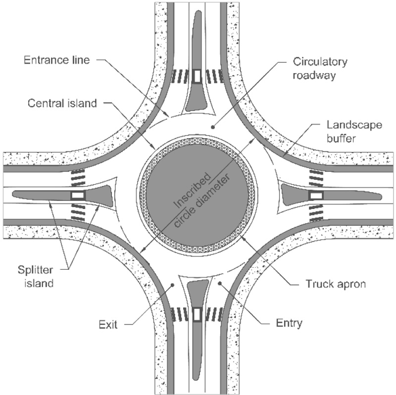 A roundabout is a form of circular intersection in which traffic travels counterclockwise (in the United States and other right-hand traffic countries) around a central island and where the entering traffic must yield to the circulating traffic [4]. In Fig. (4), the main design elements of roundabouts are shown. The central island provides a visual barrier across the intersection to the driver entering there [12] whereas the raised splitter islands at each approach separate the entry and exit lanes of a street. These splitter islands are designed to deflect traffic, reduce vehicle speed [13] and provide pedestrian refuge.