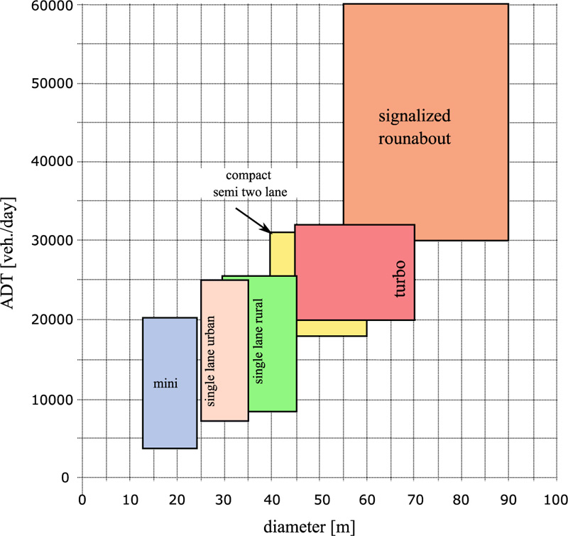 In Fig. (5), there is another demonstration of different roundabout types that could be seen according to their size (measured by inscribed circle diameter) and range of demand (measured by the ADT of the whole intersection) determined by German guidelines. It could be seen that the policy of intersection is made according to the sufficient capacity.