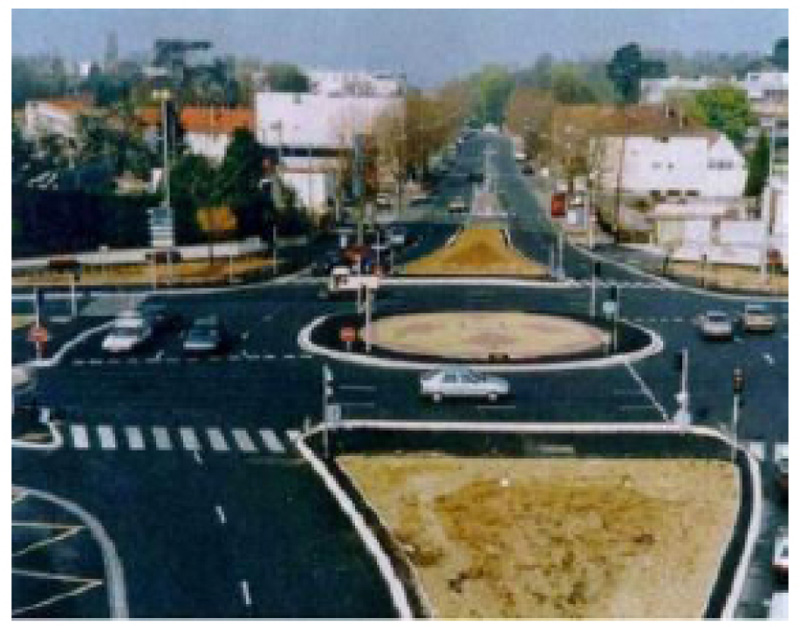 The first mini-roundabout on the public road network was put into operation in Peterborough (Great Britain) in 1968 and has been used thousands of times since then [21]. As can be seen in the chart in Fig. (5), mini-roundabouts are the intersections with low inscribed circle diameter and low capacity. They are generally used in urban areas with less operating speed. The central island can be traversed by large vehicles, as shown in Fig. (6).
