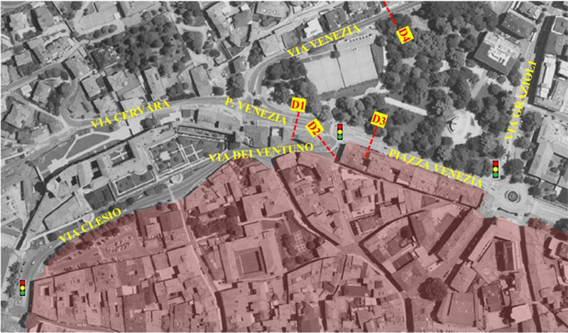 Nevertheless, the urban road network of Trento between the streets Piazza Venezia, Port’Aquila and via Dei Ventuno (Fig. 2), adjacent the historic pedestrian centre, is often congested during morning, particularly in the hourly time interval 7:30-8:30.