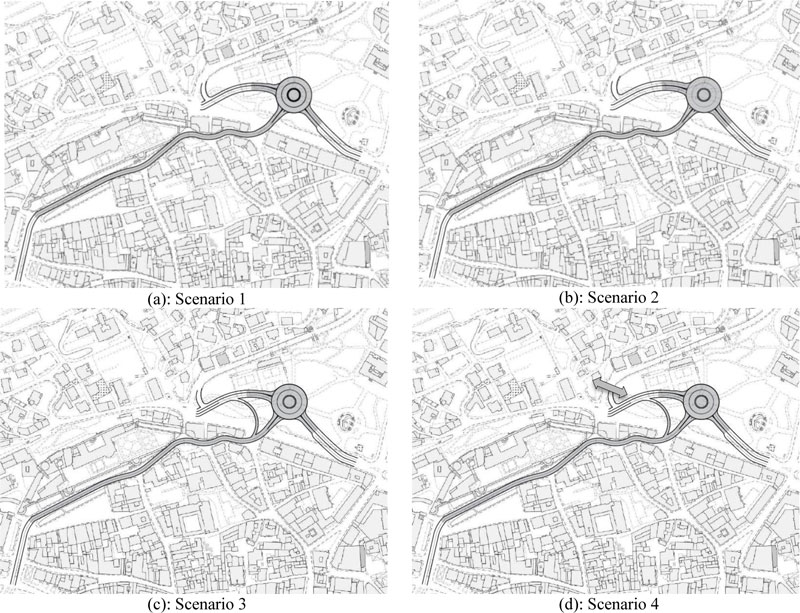 • Scenario 3: a new underground roundabout with two entry lanes, two exit lanes in each arm and a right-turn bypass lane Fig. (3c);