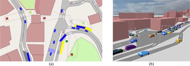 Fig. (4). Simulation of bus stops and pedestrian crossings (a): streets “via Venezia”, “via Cervara”, “Piazza Venezia”) and Signalized Intersection (b): streets “piazza Venezia” and “via Ventuno”, cfr. Fig. 2).