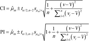 is the estimated mean friction coefficient, t is the t-statistic for the input confidence level and the number of points in the regression data. sµm|v is standard error, n is the number of points in the regression data. v is the speed.