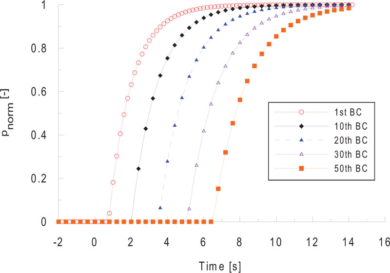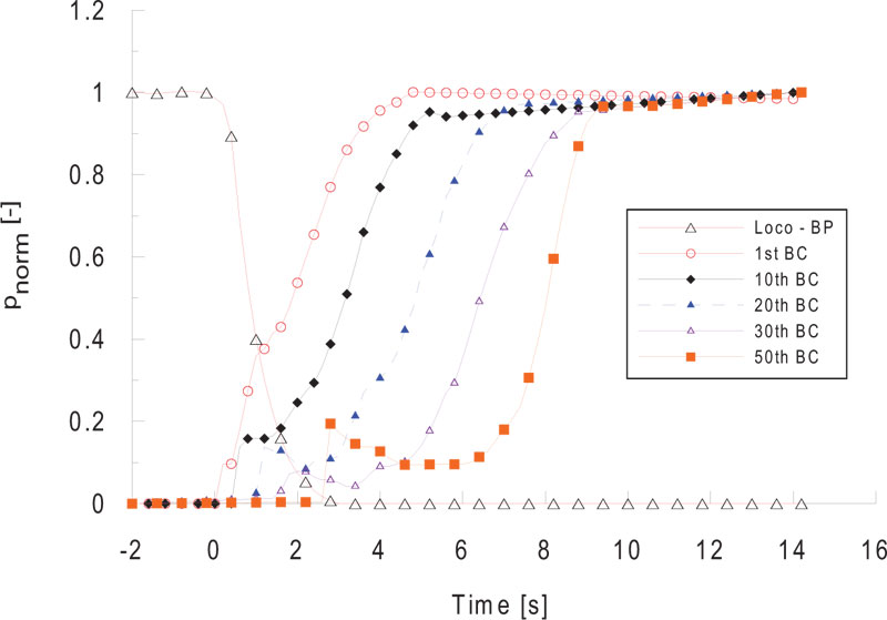 In this study, an empirical model using an exponential function was used for the pattern of braking pressure obtained through a real vehicle test. It consisted of the maximum possible wagons (50 vehicles) to measure the brake pressure pattern according to the configuration, as shown in Fig. (7). The pressure in the brake cylinder was measured on 1st, 10th, 20th, 30th and 50th vehicles at the same time.