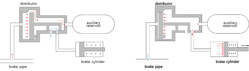 When the braking is necessary, the driver operates the brake valve, the pressure of the brake pipe is released to the atmosphere, and the compressed air in the storage tank is supplied to the brake cylinder in a locomotive. In a wagon, the air is supplied from the auxiliary reservoir to the brake cylinder through the pressure drop of the brake pipe with the unique structure of the distribution valve (Fig. 2b).