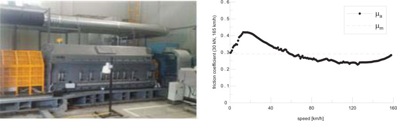 The friction coefficient, in general, varies depending on material properties and thus is not constant. In this study, with reference to UIC 541-4 [18], which stipulated the test conditions for the composite brake shoe for railway vehicles, a short program was constructed as shown in Table 2 [22, 23], and friction material testing was performed using a brake bench (Fig. 4). The locomotive and wagon had different wheel diameters and different brake shoe suppliers, so friction coefficient tests were performed in each case. The program in Table 2 was repeated four times. Since a locomotive can tow passenger cars with a higher speed than freight wagon, the coefficient of friction has been tested even at speeds higher than wagons.