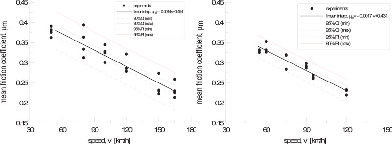 According to UIC 541-4, the average coefficient of friction is influenced by speed and braking force and may have a distribution rather than constant at the same speed. The mean friction coefficient shows that it can be modeled in a linear relationship above a certain speed (60 km/h) [18, 24]. In order to predict the distribution of the mean friction coefficient for use as the input of the LTD simulation, the test results were linearly interpolated and statistically estimated using Confidence Interval (CI) and Prediction Interval (PI) [25].
