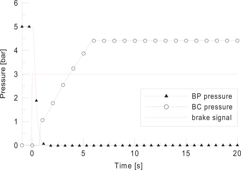 Since the brake cylinder pressure patterns of locomotive and wagon are different, modeling is required for each vehicle for LTD simulation. The pressure of the brake cylinder (BC) of the locomotive was measured while the braking operation was in a stationary state. The measured results are shown in Fig. (6). In the locomotive, the brake pipe (BP) pressure rapidly decreases with the braking, and the BC pressure starts to rise. The BC pressure rises rapidly to 1 bar and then linearly to 4.5 bar.