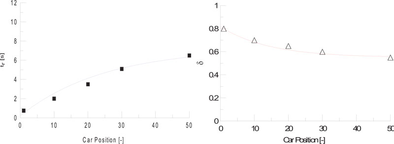Here, pith (t) is braking pressure in each vehicle constituting the train, pmax is the maximum braking pressure achieved when braking, tr is the time when the braking pressure starts to rise, and δ is a characteristic variable according to the brake system. The time delay and the braking characteristic variables at which the braking pressure starts to rise are regressed using the test results and shown in Fig. (9).