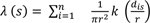 Where, λ (s) is the density at location s, r is the search radius (bandwidth) of the KDE, and k is the weight of a point i at a distance dis to location s. k is usually modeled as a function (called kernel function) of the ratio between dis and r.