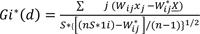 Where, Xj is the attribute value for feature j, Wij is the spatial weight between feature i and j, n is equal to the total number of features and: