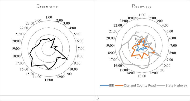 Fig. (10a and b) illustrate how the number of crashes across the FPIR, from 2005 to 2014, varied throughout the day. It is evident that the number of crashes was high at 9:00 am, 1:00 pm, and 4:00 pm, which indicates that most crashes occurred during peak traffic hour. Fig. (10b) shows the crash distribution for three types of roadways: Indian Reservation Roads, City and County Highways, and State Highways. State Highways had higher crash frequency than county roads and reservation roads. While state highway frequency peaks were at 9 am and 4 pm to 6 pm (during peak hour traffic), the crashes on county and reservation roads are distributed throughout the day with the highest frequency at 9 am, 1 pm, and 6 pm. These roads had crashes occuring at midnight (between 12 am and 3 am) when traffic volume is low. Impaired driving is one of the leading causes of crashes on Indian reservations, and may contribute to this high crash occurrences due to its occurrence during night time.