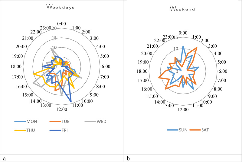 The temporal analysis enables investigating whether time has an impact on crash occurrences. The time at which crashes occur is crucial to analyze the pattern of crashes and increase infrastructure and emergency response. Spider graph has been used widely to assist in picturing the pattern of crashes over time. As the spider plot has no beginning or end due to its circular nature, it is easier to assess the time interval that is shown discontinuously on the bar chart (e.g. 9 am to 5 pm). Also, only a glance is required to understand the crash pattern throughout the day as the graph resembles a clock.