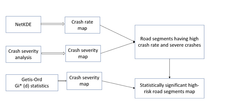 Finally, the Spatial join tool was used to join high-risk road segment map generated through NetKDE and other GIS tools, and Map from Getis-Ord Gi* (d) statistics to determine the statistically significant crash hotspots in the FPIR.