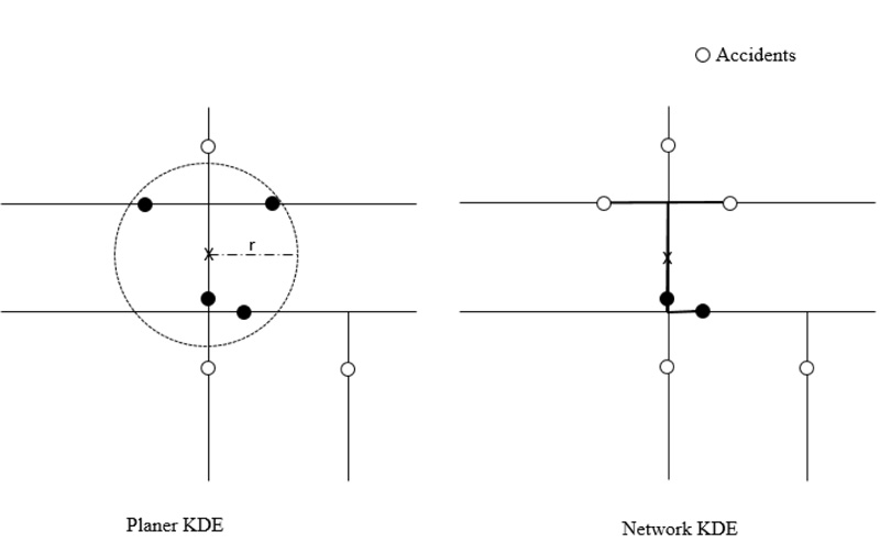 Conceptually, Network Kernel Density Estimation (NetKDE) is an extension of the KDE process. Planar KDE methodology computes density, considering that point events are randomly distributed throughout the Euclidean space. However, traffic crashes do not take place in an open space rather than in roadway networks upon which traffic flows. Therefore, each event has a much stronger influence on their neighbors on the network rather than on a 2-D plane with a constant search radius r. This discrepancy leads to an overestimation bias of up to 20% in planar KDE results when used in a network context [11]. To address this issue, recent researches have focused on the development and use of a KDE in which the neighborhood bandwidth is calculated through a network instead of over Euclidean space. This tool is known as the NetKDE. Instead of computing the density over an area unit, the equation estimates the density of a linear unit. It was first developed by Okabe et al. in 2006 [21] and used in many cases to address the limitation of planar KDE and provide a more accurate interpretation of the distribution of network-bound point events [12]. Fig. (4) presents the difference between the two KDE methods.