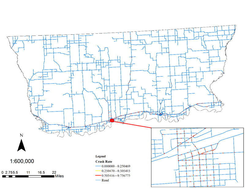 The NetKDE analysis revealed several clusters of crash-prone areas. The result displays a higher degree of linearity due to the network-based calculation. Because of the small bandwidth, high crash rate areas generated the steeper slope. The crash rate map can be found in Fig. (4).