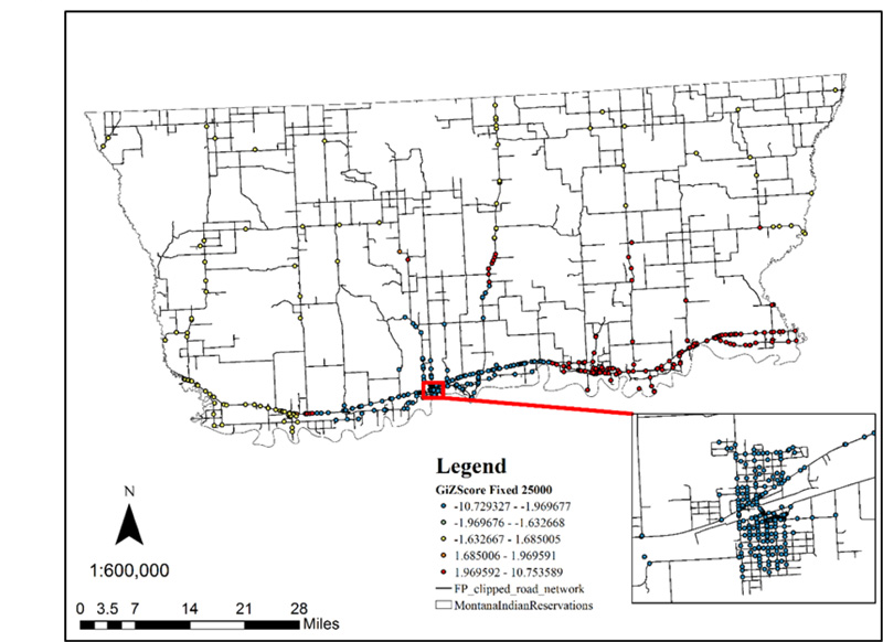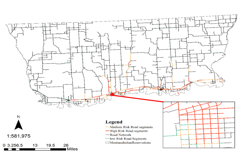 The results of the NetKDE map and crash severity map (Fig. 6) were overlaid to generate a high priority map for ascertaining high risk roads with high crash rate and more severe crashes. The high-risk road segment map, depicted in Fig. (7) presents the results of high-risk road segments. Red color indicates the high-risk road segments, while yellow and green colors represent the medium and low-risk road segments. Some parts of the US highway 13, BIA route 1, and US highway 2 are among the many segments being identified as high-risk road segments in this analysis. Also, although some residential roads have PDO crashes, they have been detected as high priority areas due to high crash occurrence.