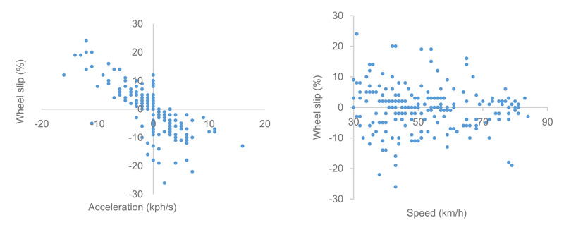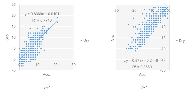 Fig. (3) shows relationships between the slips (unitless) and the accelerations (kph/s) of three types of experiment cars on dry surfaces. Based on the relationships, lower and upper limits at 0.001 significance level can be drawn (see Table 1). All the statistics in Table 1 were proven to be statistically significant by the t-tests. If any observed slip deviates from the confidence interval, it is then classified into a record from the slippery surface. The slips are unitless and the accelerations are in the unit of kph/s.