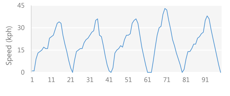 Data were collected on a specially designed test track with level terrain where adverse weather conditions such as snow, rain, and fog can be arbitrarily created. Three types of vehicles, including a passenger car, a sport utility vehicle, and a recreational vehicle as photographed in Fig. (4), were driven repeatedly on the track when the pavement was dry and covered with snow in January 2019. The experiment conditions were almost consistent because the experiments were performed for about half an hour for dry and snowy conditions, respectively. It should be noted that the purpose of this study is to develop methods for identifying slippery conditions, so it is not necessarily required to maintain the exact same level of slipperiness. Fig. (5) shows the driving pattern of the experiment vehicles outfitted with digital tachographs (DTGs). The driving pattern can be normally observed at intersections where acceleration and deceleration maneuvers repeatedly occurred. The experiment cars’ wheel and transition speeds were recorded on the tachographs on a second basis. In total, 4,122 sets of records were gathered.