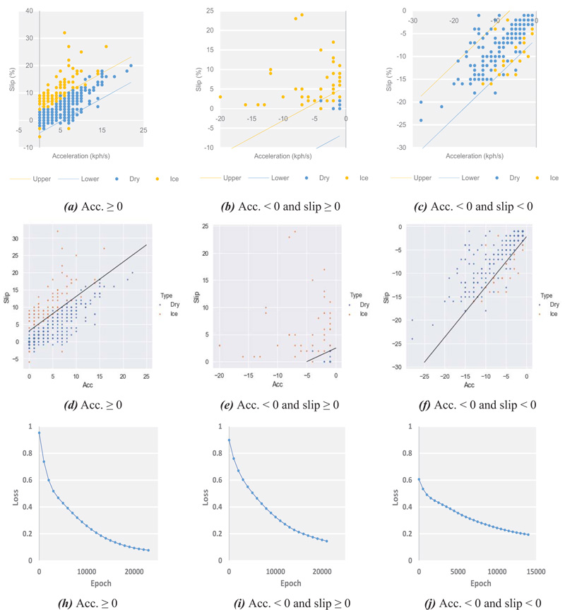 For conducting performance tests on the suggested methods, the experiment data were categorized into three groups according to vehicle dynamic characteristics: 1) acceleration, 2) deceleration with non-negative slips, and 3) deceleration with negative slips. Group 2 indicates that TCSs were activated while stepping on the accelerators, where car speeds decrease even though the accelerators were activated. In each group, 70% of the data were used for training or setting confidence intervals and the remaining 30% were reserved for testing, as represented in Table 2. It should be noted that for testing group 2 by regression analysis, the confidence interval for group 3 was utilized because a regression model for group 2 could not be established, due to a lack of relationship between the slip and the acceleration data of group 2, as shown in (Fig. 6b).
